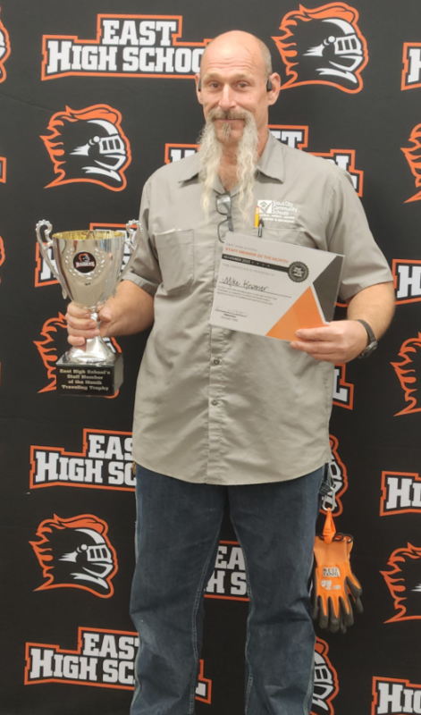 "Mike is an incredible asset to EHS. He works hard to make our building and grounds look great. He is great at solving problems, cleaning up messes, fixing what is broken, and getting things done--all with a positive attitude. He goes above and beyond his responsibilities and interacts with students day-to-day. With teacher approval, students can shadow him during small projects so they can learn different hands-on skills. The students jump at the opportunity to help him. Mike really puts his heart and soul into supporting students and staff. Congratulations Mike!"